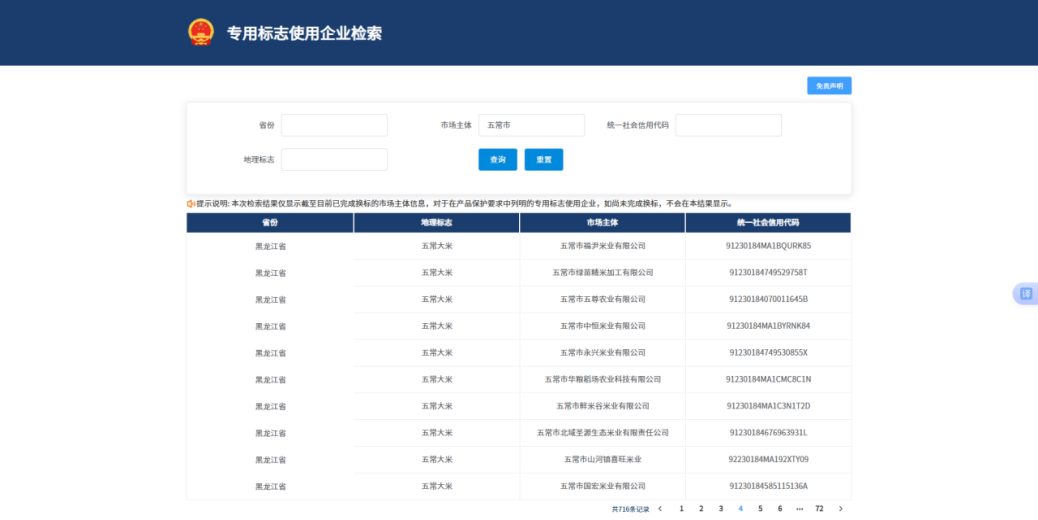 570 | 五常市中仓米业有限公司 | 91230184MABPKNAW78 | 经黑龙江省知识产权局公告 | 黑龙江省知识产权局地理标志核准使用公告第三十九号 | 2023年7月26日 | 生产 |
